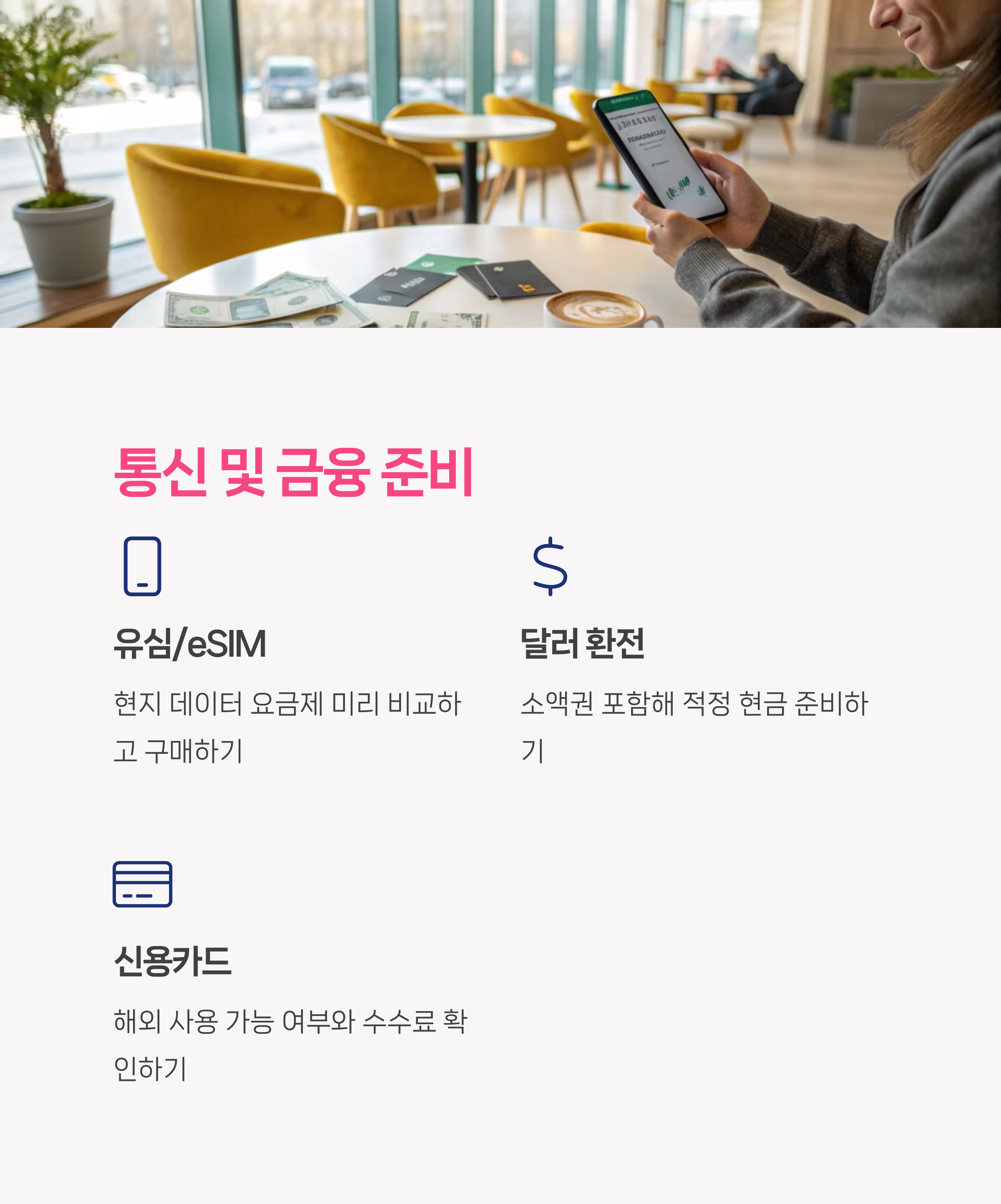 환전은 보통 한국에서 1차로 달러를 준비하고, 미국 현지에서는 카드 결제를 주로 사용합니다. 하지만 팁 문화가 있는 미국에서는 소액 현금이 꼭 필요하므로, 1달러, 5달러 지폐 위주로 준비해 두는 것이 좋습니다. 그리고 휴대폰은 로밍보다는 유심칩 또는 eSIM을 활용하는 것이 훨씬 경제적입니다. 대중교통 이용 시 구글 맵을 활용하면 교통편 확인이 쉬우며, 무료 와이파이보다 보안이 안전한 유심 데이터 사용을 권장합니다.