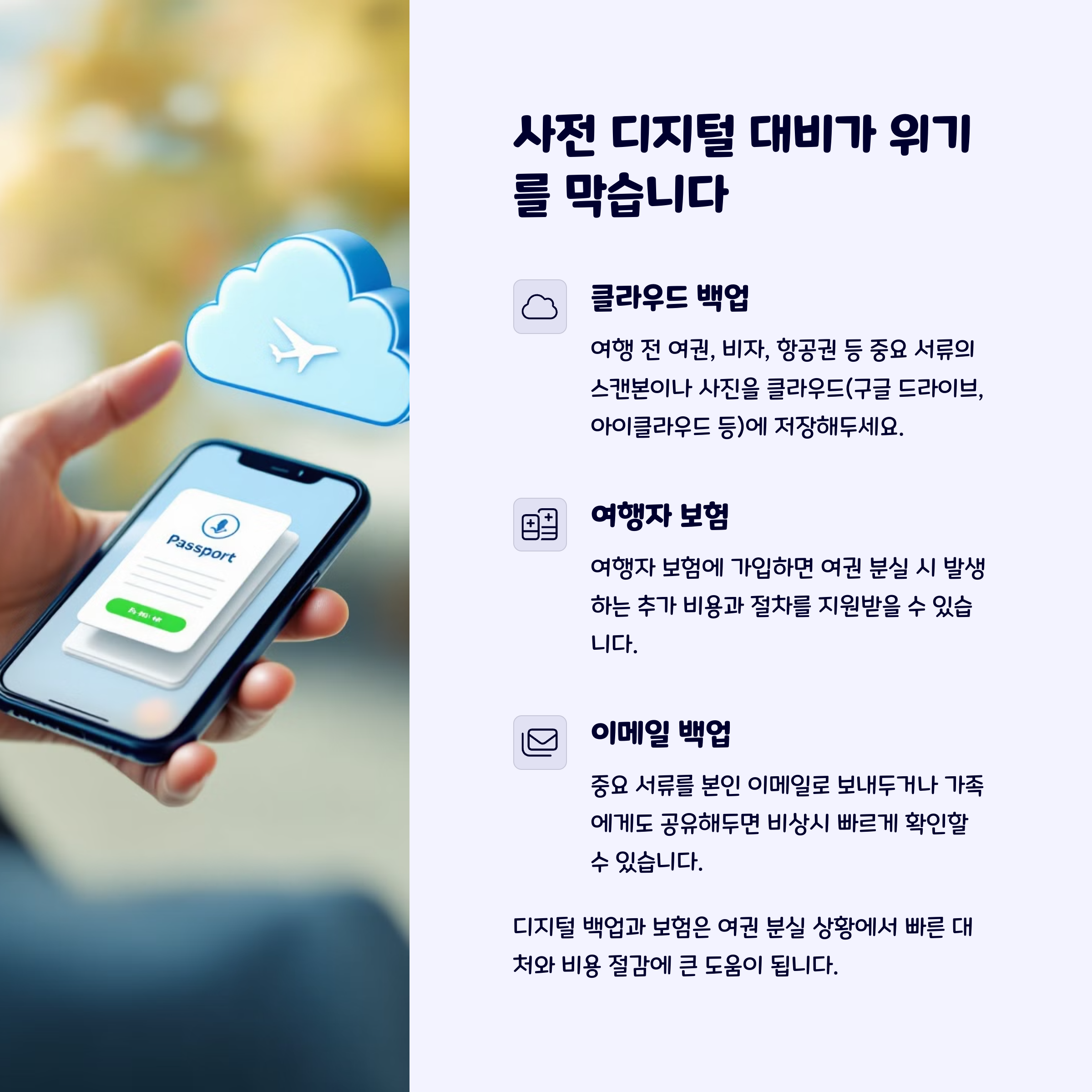 여권 사진은 이메일이나 클라우드에 저장해 두세요. | 출국 전 해당 국가의 대사관 위치를 확인하세요. | 여권 분실 시 보험 적용 가능 여부를 확인하세요. |