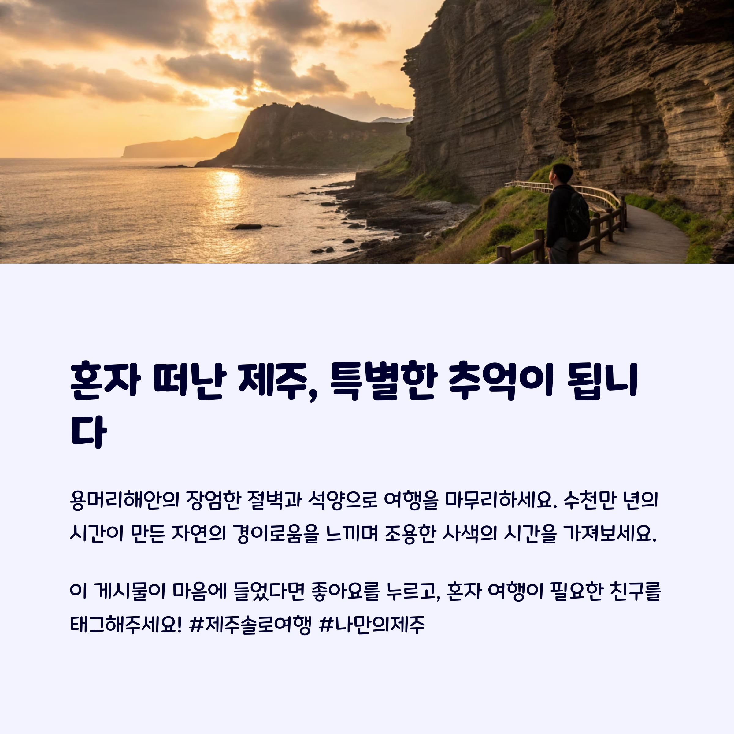 안녕하세요! 저는 지난봄에 아무런 계획 없이 훌쩍 제주도로 혼자 떠났던 경험이 있어요. 혼자라는 이유로 조금 걱정되긴 했지만, 예상보다 훨씬 자유롭고 여유로운 여행이 됐죠. 조용한 바닷가를 따라 걷고, 나만을 위한 시간을 보내며 마음이 정화되는 걸 느꼈거든요. 오늘은 그런 저의 경험을 바탕으로 혼자서도 충분히 행복할 수 있는 제주도 추천 코스 7곳을 소개해 드릴게요. 혼자서도 충분히 낭만적이고, 또 때로는 감성적일 수 있는 여행, 우리 같이 떠나보아요!